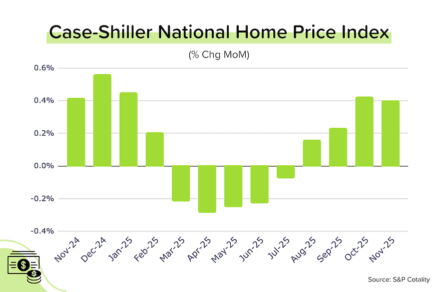 Along with renewed buyer demand, home prices are starting to rise again. For much of 2025, the Case-Shiller national home price index had slowed, but we’ve recently seen a reversal, with prices increasing 0.4% in both October and November. We expect this trend to continue as December data rolls in and we move further into 2026.